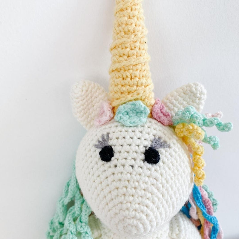 Say hello to Rose the Unicorn, a magical friend who believes in dreams, kindness, and a little sparkle of imagination. Hand-crocheted from organic cotton in soft pastel shades, Rose is as gentle as she is enchanting. Whether she’s galloping through make-believe lands or resting on a nursery shelf, she reminds us that magic is real when it’s made by hand.